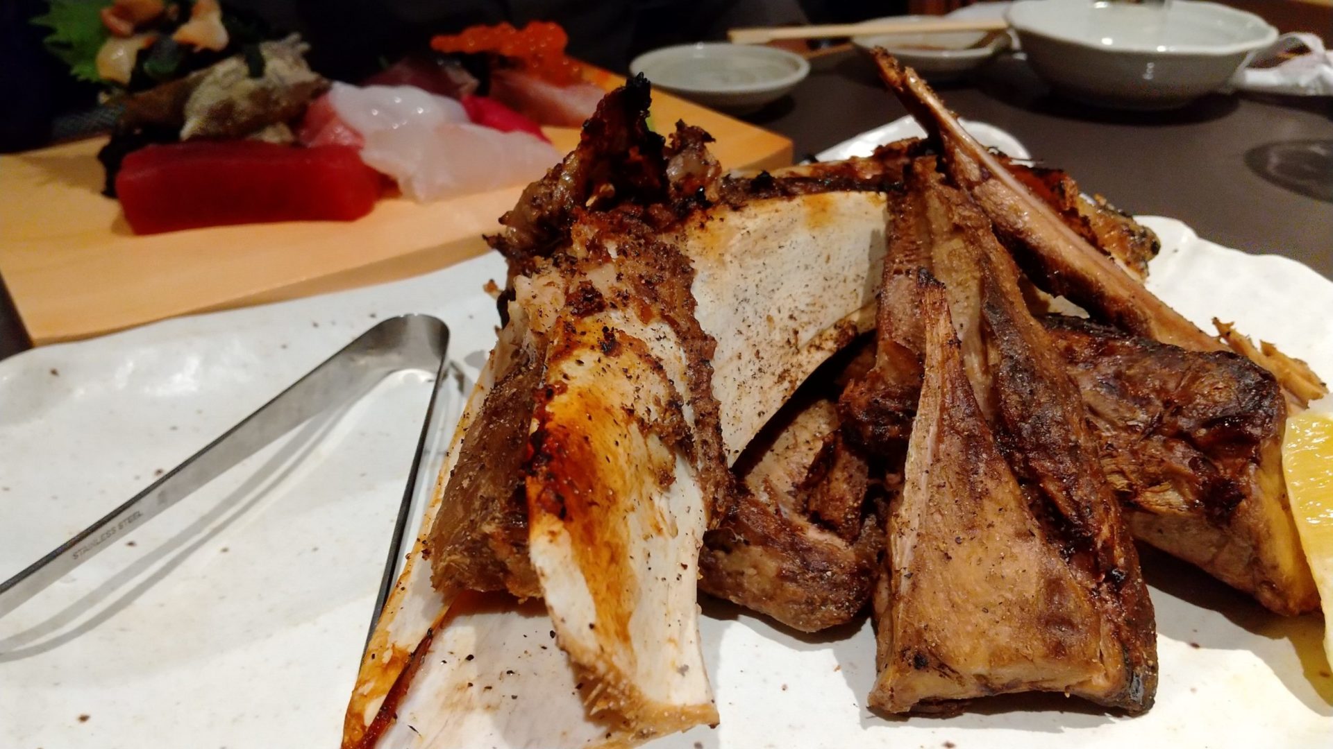 大将が目の前で炙ってくれるマグロのほほ肉は、コップ酒にばっちり。